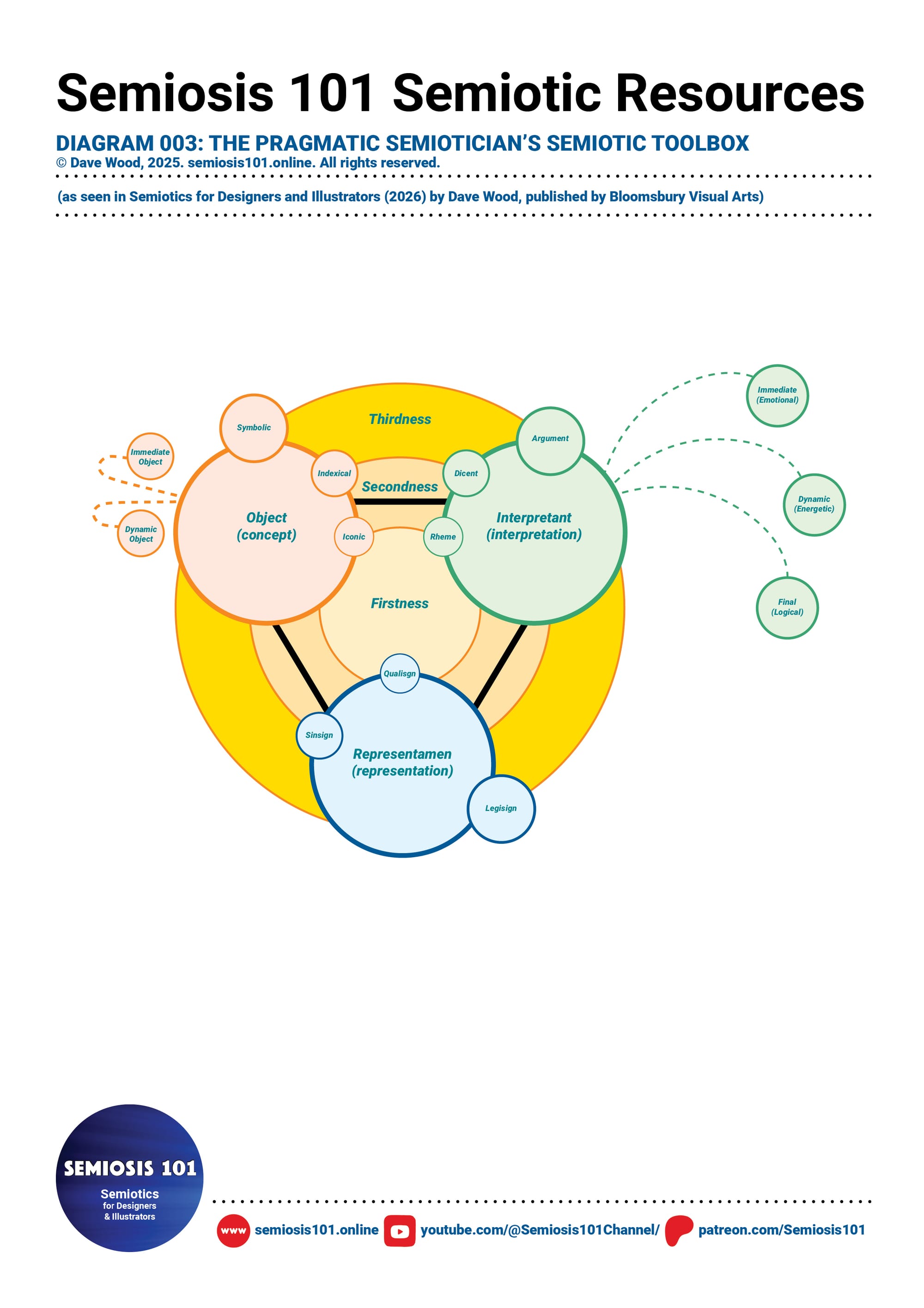 The main text was written for creatives rather than semioticians, and although I wrote it in plain language, it did introduce Peirce’s obtuse terminology to the lay-reader. From my Semiotic Rosetta Stone research I translated his terms into a meta-language of creative-friendly terms aligned to tacit language illustrators and designers already understood. In many Semiosis 101 episodes (and in the book) I reassure academics and semioticians that this is not a dumbing-down of Peirce’s theory. It is a simple contextualisation of his theory into Visual Communication Design.