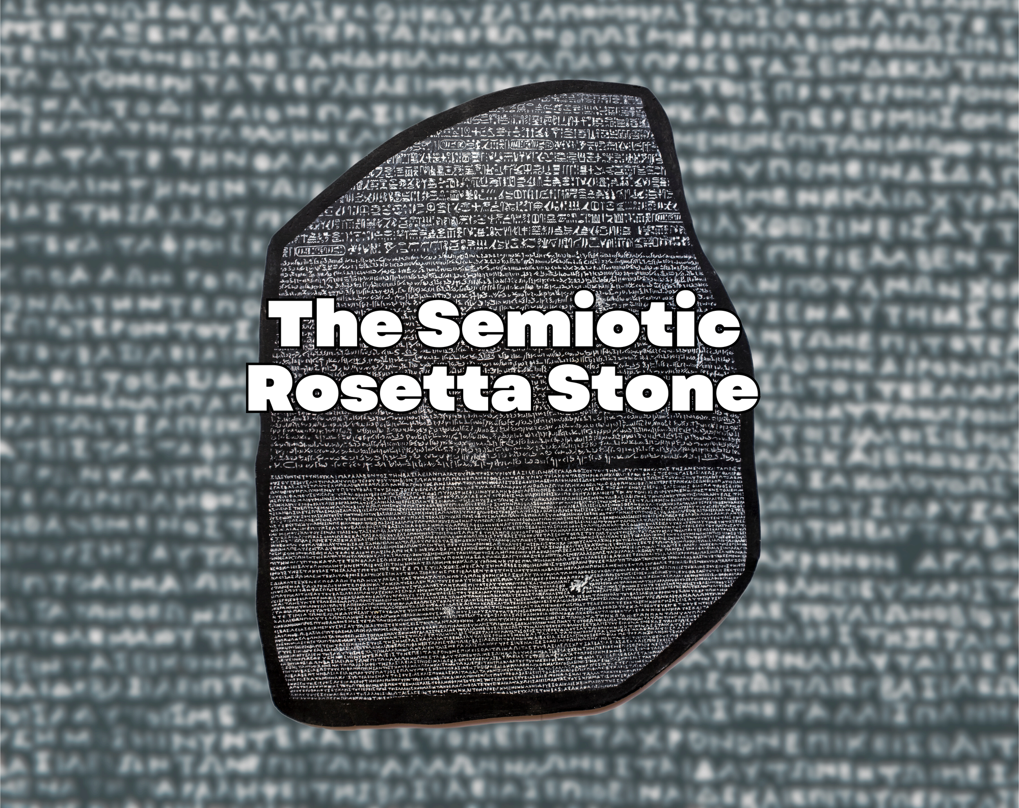 Just as the historic Egyptian Rosetta Stone helped translators to finally understand hieroglyphics, my book performs the same service for illustrators and designers to understand Peirce’s Semiosis. The original Rosetta Stone featured the same text written in three forms: Ancient Greek, Demotic Script and Hieroglyphics. Greek was known to the translators, so through using the Demotic script (a cursive form of Hieroglyphics) as a meta-language, they broke the code.